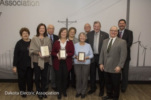 Touchstone energy winners holding their plaques with Dakota Electric board members.