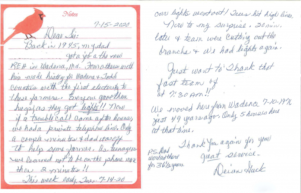 As a local business, we are proud to power your life and bring good things to our community. So, when we receive a letter from a member thanking us for our service, we are happily reminded of the foundation on which our cooperative is built; commitment to community.