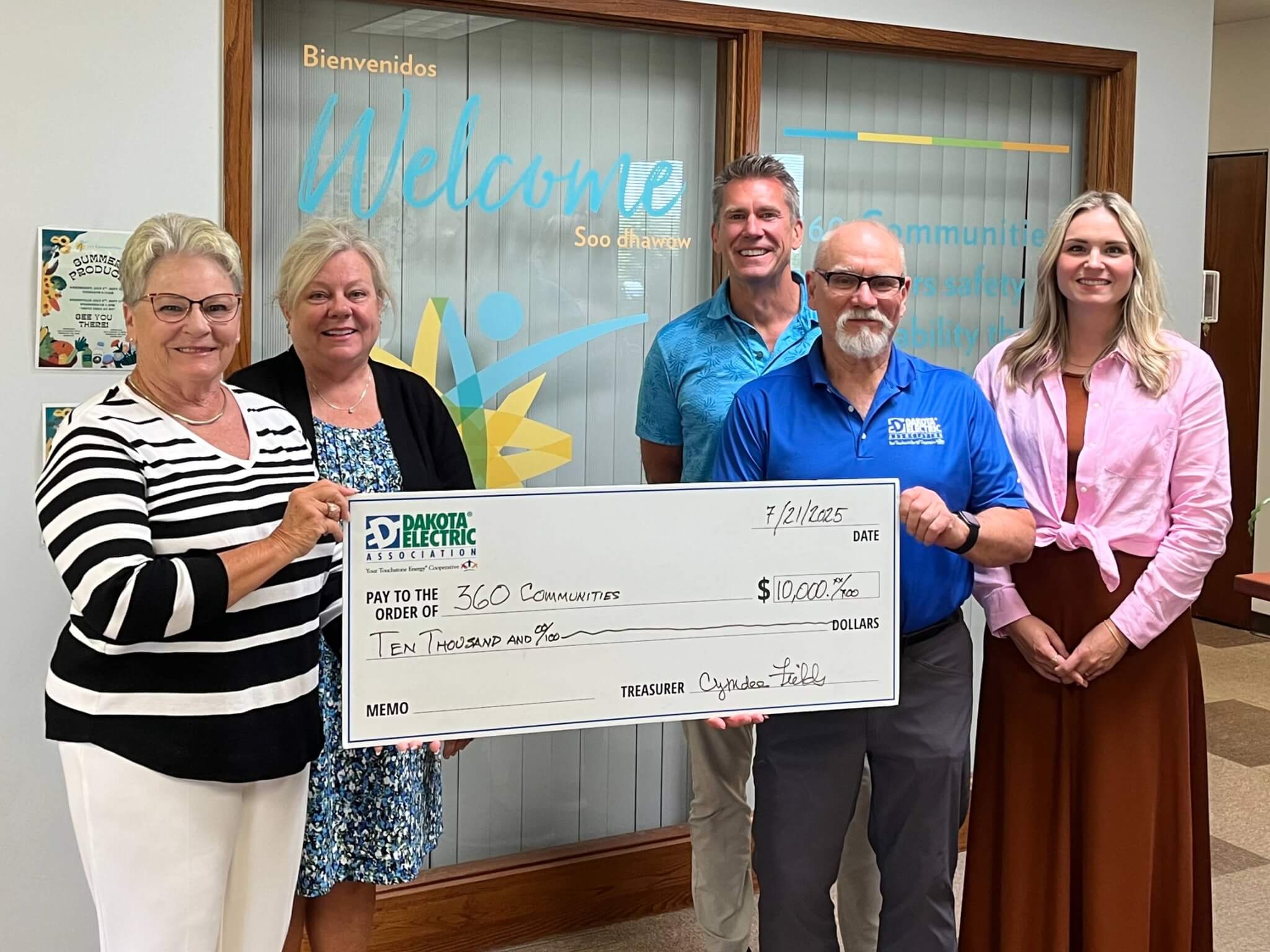 Dakota Electric, in partnership with CoBank, donated $25,000 to local organizations making a difference in Dakota County. 360 Communities and Beyond the Yellow Ribbon each received $10,000, and The Open Door and Meals on Wheels received $5,000. The contributions were matched through CoBank’s Sharing Success grant, doubling the impact for our community.