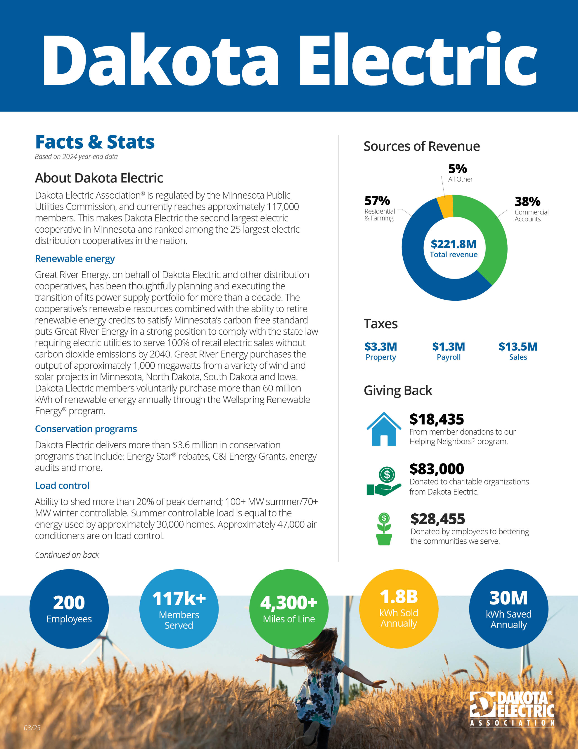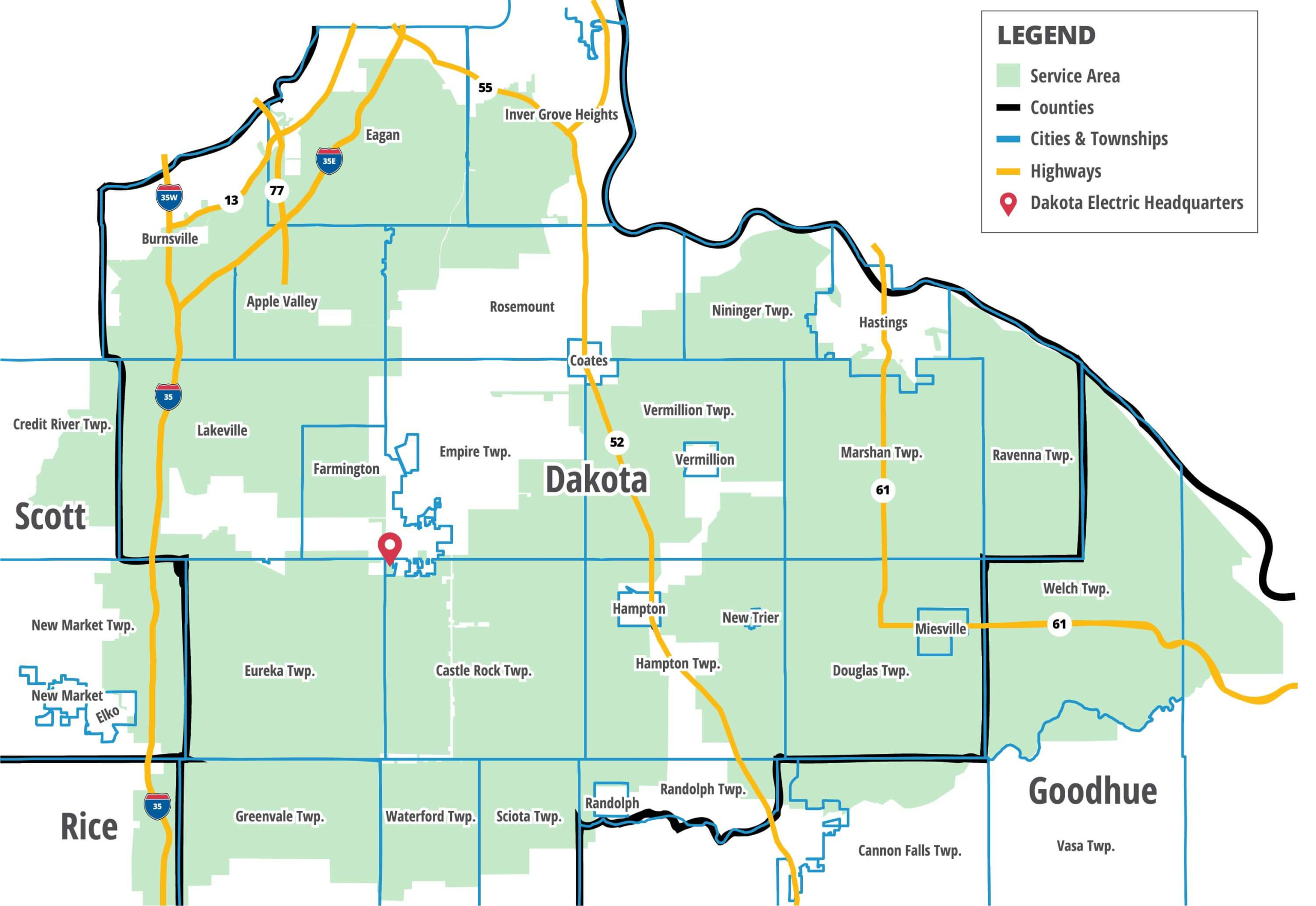 Dakota Electric Association purchases wholesale electricity from Great River Energy, a generation and transmission cooperative in Maple Grove, MN. We deliver electricity to homes, businesses and farms in parts of Dakota, Goodhue, Scott and Rice counties.