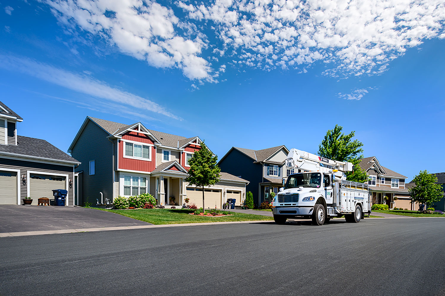 Blue Sky, Dark Gravel, White bucket truck driving down the road