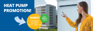 Banner for heat pump promotion, air source heat pump, woman in yellow shirt turning on a mini-split heat pump and a blue block graphic