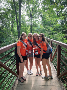Four local youth smile as they stand on hiking bridge. Full green trees surround them. They are each wearing an orange youth tour shirt.