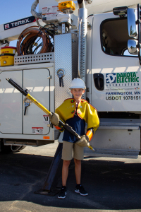 teenage boy standing in front of a Dakota Electric bucket truck. He is wearing rubber sleeves, a hard hat, a shot gun stick and smiling.