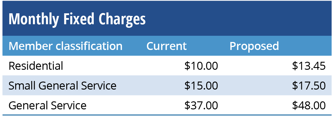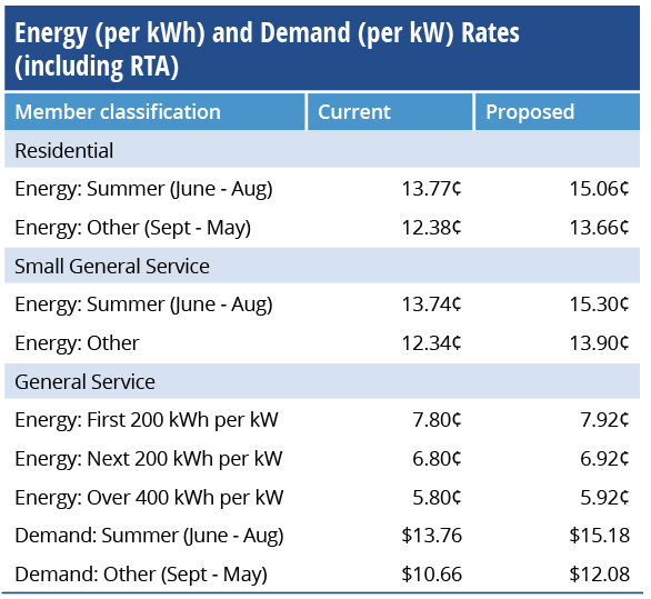 While this rate increase is necessary, we remain committed to transparency and fairness. While the effect of the proposed increase on your bill will vary depending upon member classification and amount of energy use, the average monthly bill for a residential member will increase by $13.11 from $98.41 per month to $111.52 per month. The charts below provide more detail on the impact of proposed increases for each member classification. You can also download our rate filing brochure to learn more.