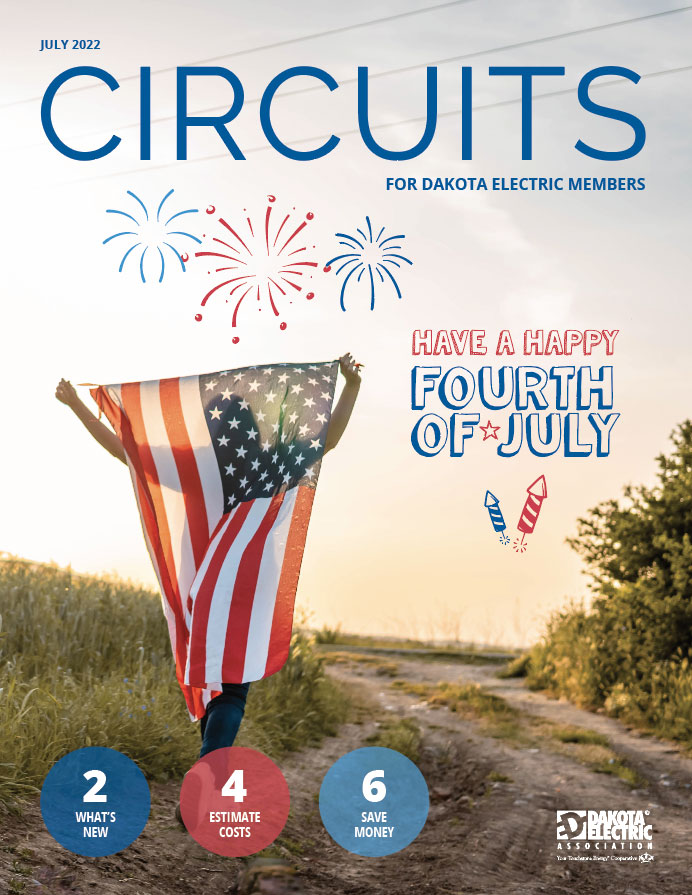 Cover shot of Circuits magazine. A woman holding the American Flag behind her walks into the sunset on a gravel road. A message saying, “Have a Happy Fourth of July” is placed next to her.